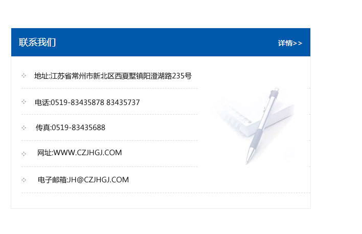 地址:常州市新北區友邦商務大廈1幢16、17層  電話:0519-85101652  傳真:0519-85112595  郵編:213022  網址:www.cz-jiayue_cn.gwe9.com  郵箱:xiajifengaa@163.com